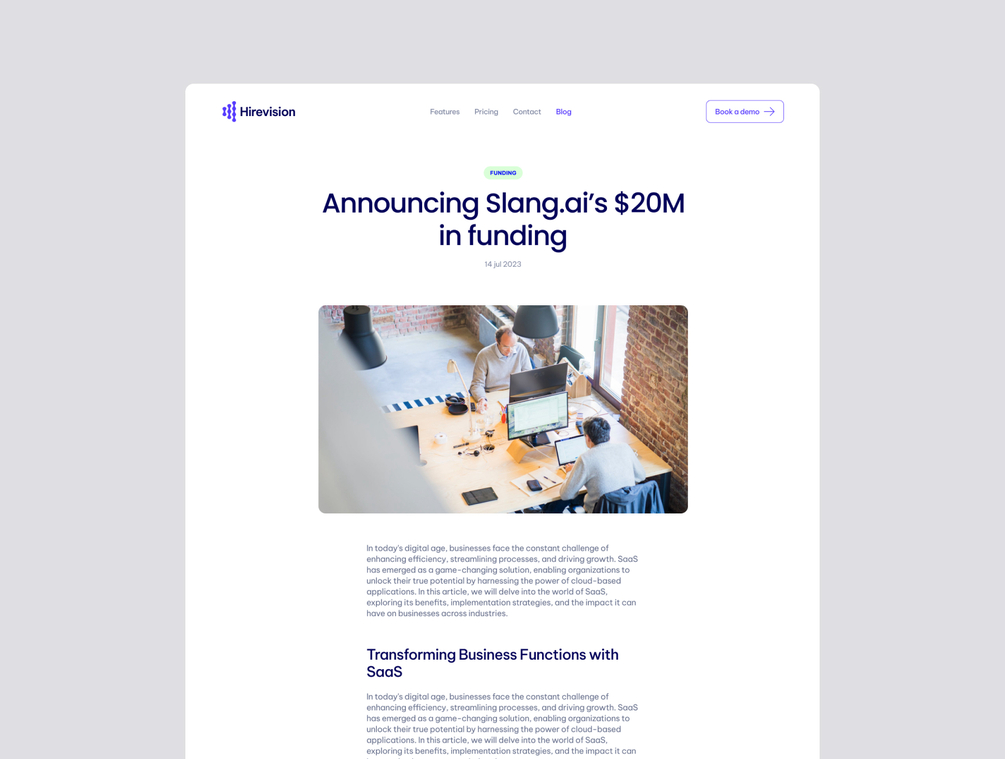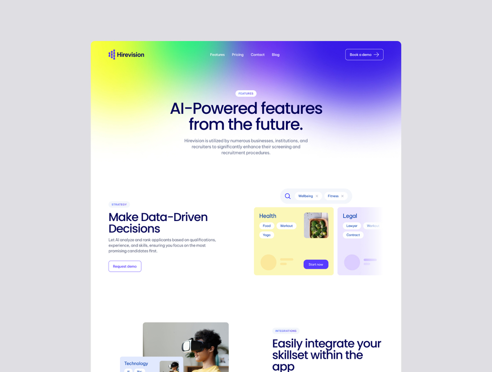 Seamlessly designed to resonate with your tech-savvy audience, Hirevision blends cutting-edge aesthetics with powerful functionality, helping you stand out in the competitive AI landscape.